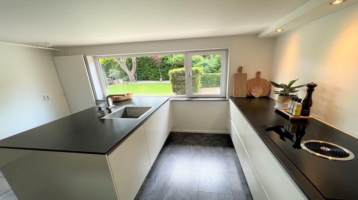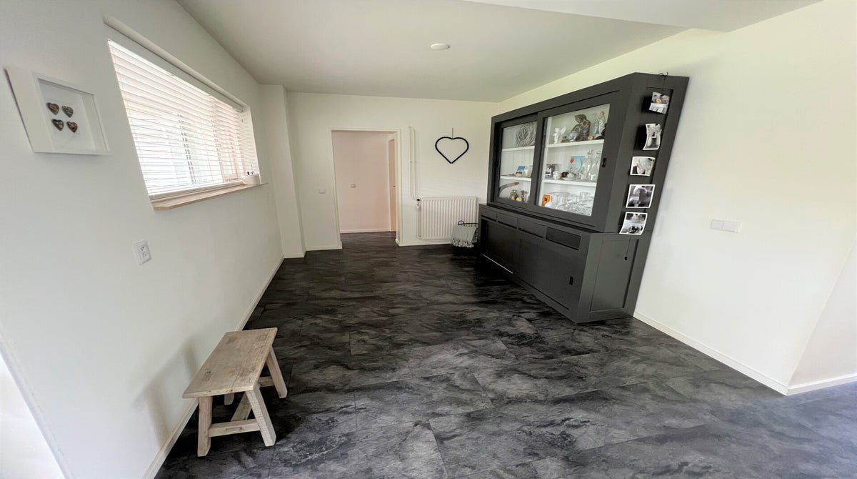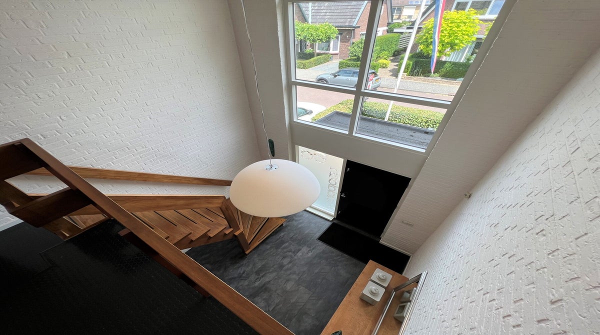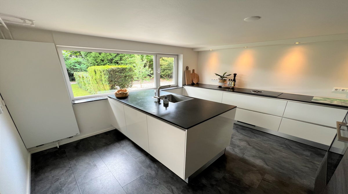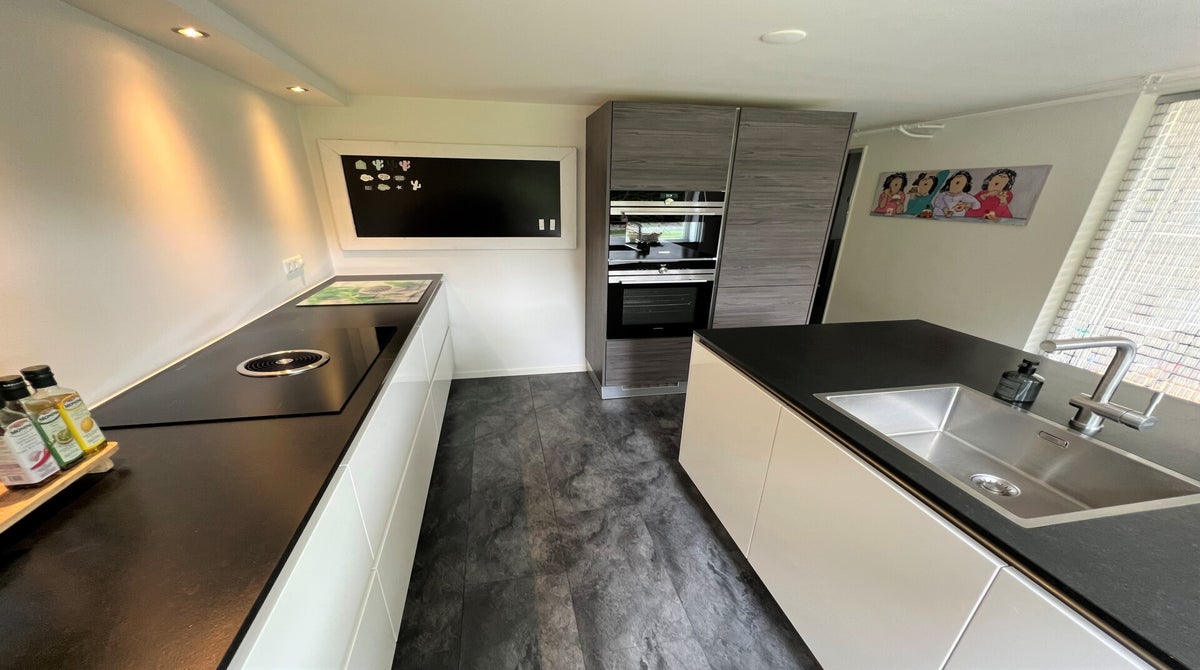 Vanaf de oprit, waar zeker plaats is voor het parkeren van twee auto's komen we bij de entree van de woning. De royale hal met veel lichtinval door de hoge raampartij en mooie vide, geeft meteen al bij binnenkomst een super uitstraling. In de hal bevinden zich de vernieuwde meterkast en toiletruimte met fontein. Via een mooie industriële deur bereiken we de woonkamer. De achterzijde van de woning is voorzien van een schuifpui naar de prachtige veranda, waar je heerlijk kunt relaxen op een zonnige dag. Vanuit de woonkamer komen we in de moderne keuken. De keuken is voorzien van een natuurstenen aanrechtblad, spoeleiland met vaatwasser en gootsteen. Aan de andere zijde van de keuken bevinden zich de koelkast met vriezer, combi-magnetron en combi-oven, beide met handige zelfreinigende functie. Aan de lange zijde is er veel kastruimte en de bevindt zich de Bora kookplaat met geïntegreerde afzuiging. Vanuit de doorgang van de keuken naar de kamer is tevens de handige inpandige garage bereikbaar. De garage is voorzien van verwarming, een keukenblok met aparte wasbak en een opstelplaats voor de wasmachine en wasdroger.